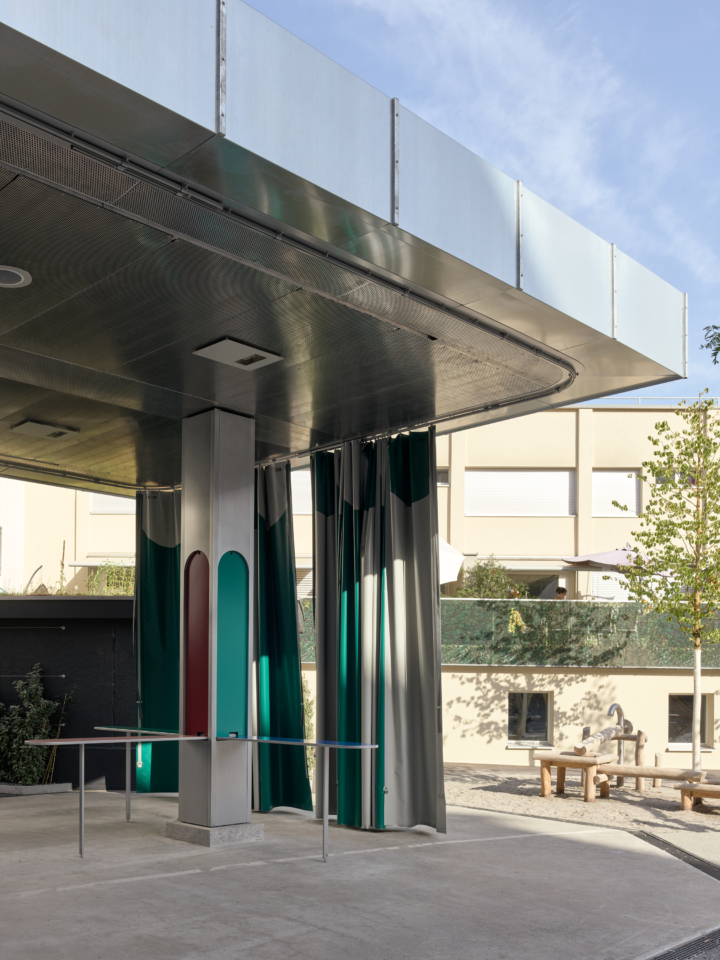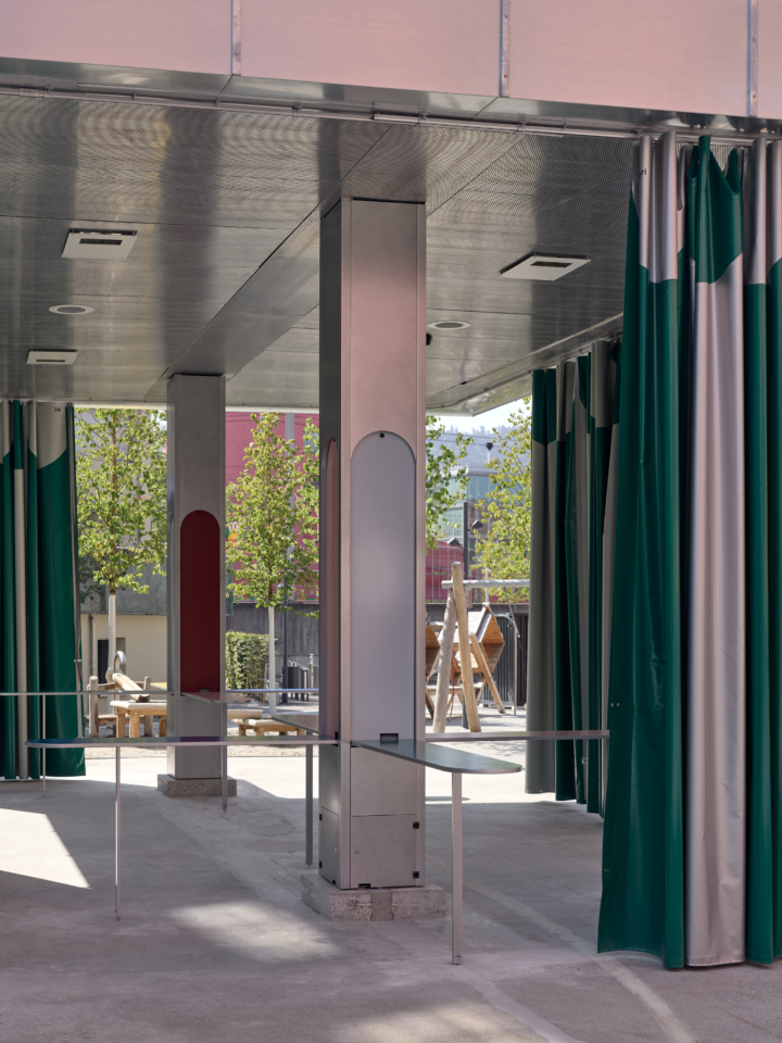 Klappbare Stehtische wurden in die bestehenden Säulen integriert, sodass der Raum als informeller Treffpunkt für Apéros genutzt werden kann. Wenn die Tische eingeklappt sind, lässt sich die Struktur als Bühne für Gemeinschaftsveranstaltungen wie das Frühlingsfest oder den Weihnachtsmarkt umfunktionieren. Motorisierte, von der Decke herabfahrbare Traversen bieten ein flexibles System zur Installation von Beleuchtung und audiovisueller Technik. Abnehmbare Akustikvorhänge wurden installiert, um die Lärmbelastung des angrenzenden Hotels während Veranstaltungen zu verringern. Die Vorhänge lassen sich flexibel positionieren, sodass die Nutzer den Grad der Offenheit oder Privatsphäre je nach Bedarf der jeweiligen Veranstaltung anpassen können.