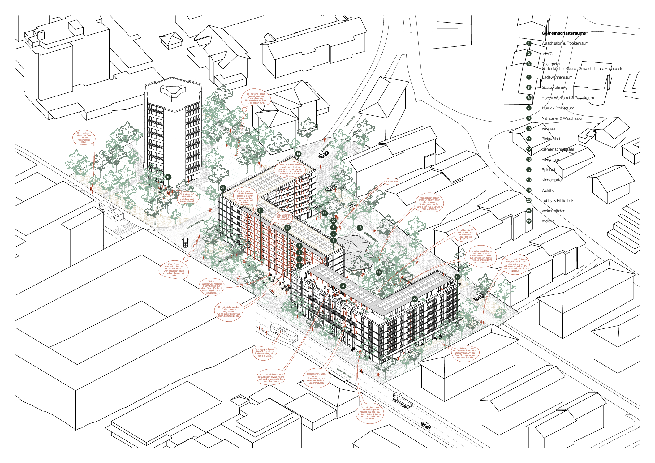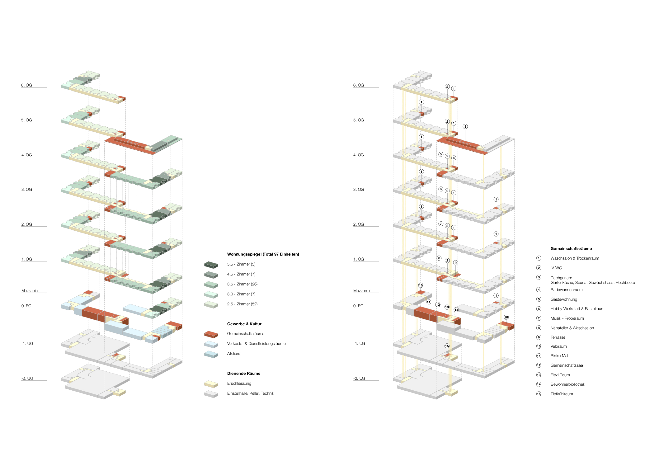 The client, Building Cooperative Matt — which operates numerous cooperative housing projects in the region — requested a mix of apartment sizes, with at least one quarter designed as compact, elderly-friendly units complemented by attractive shared facilities. The objective is to encourage older residents currently occupying affordable yet underused family apartments to downsize, thereby freeing up larger units for families — a group facing sustained housing demand in the Canton of Lucerne.